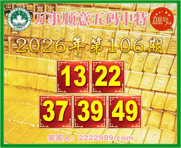 106期: 《万事顺意》 五码中特【13.22.37.39.49】开:22